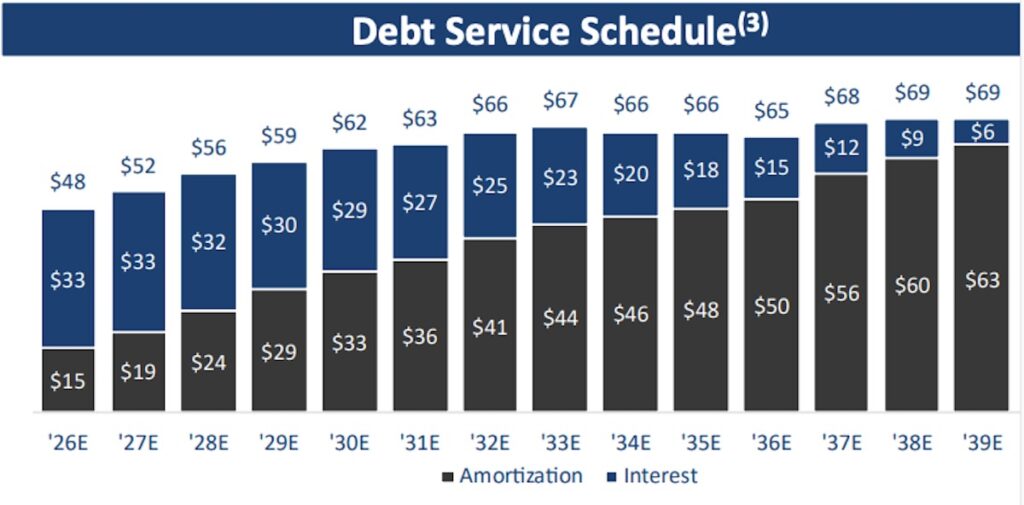 OK, so yes, that sounds like a rational debt to hold… but investors are really used to thinking only about the interest costs of debt, not paying it off, and the amortization schedule of this debt means it also eats a lot of the cash flow. This is the debt service schedule from the company — remember, at this point, they are producing about $74 million in EBITDA, so 2/3 of that is already spoken for (Interest is the I, and Amortization the A in EBITDA, so you can see why they keep emphasizing the Earnings Before (EB) those items):