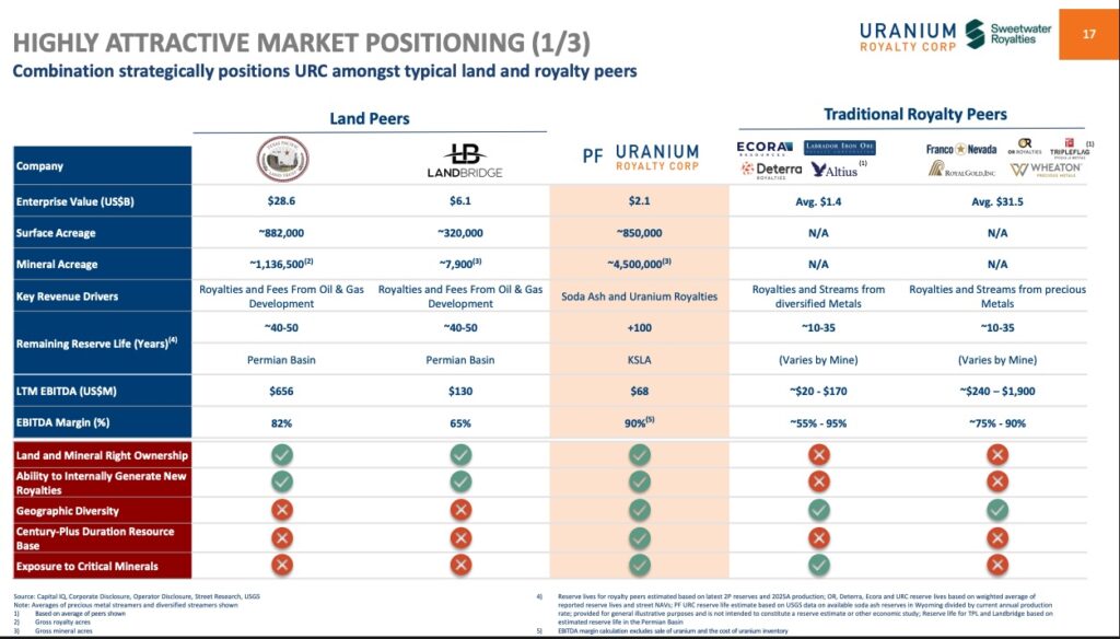 “Put simply, this combination adds significant cash flow and strategic land holdings to accelerate Uranium Royalty growth. It increases URC annual EBITDA to approximately $74 million and immediately positions URC as a cash flowing company from well-established royalties from mines in the world’s leading trona jurisdiction that will see production for 100+ years. These are leading assets in the first quartile of total production cost.”
