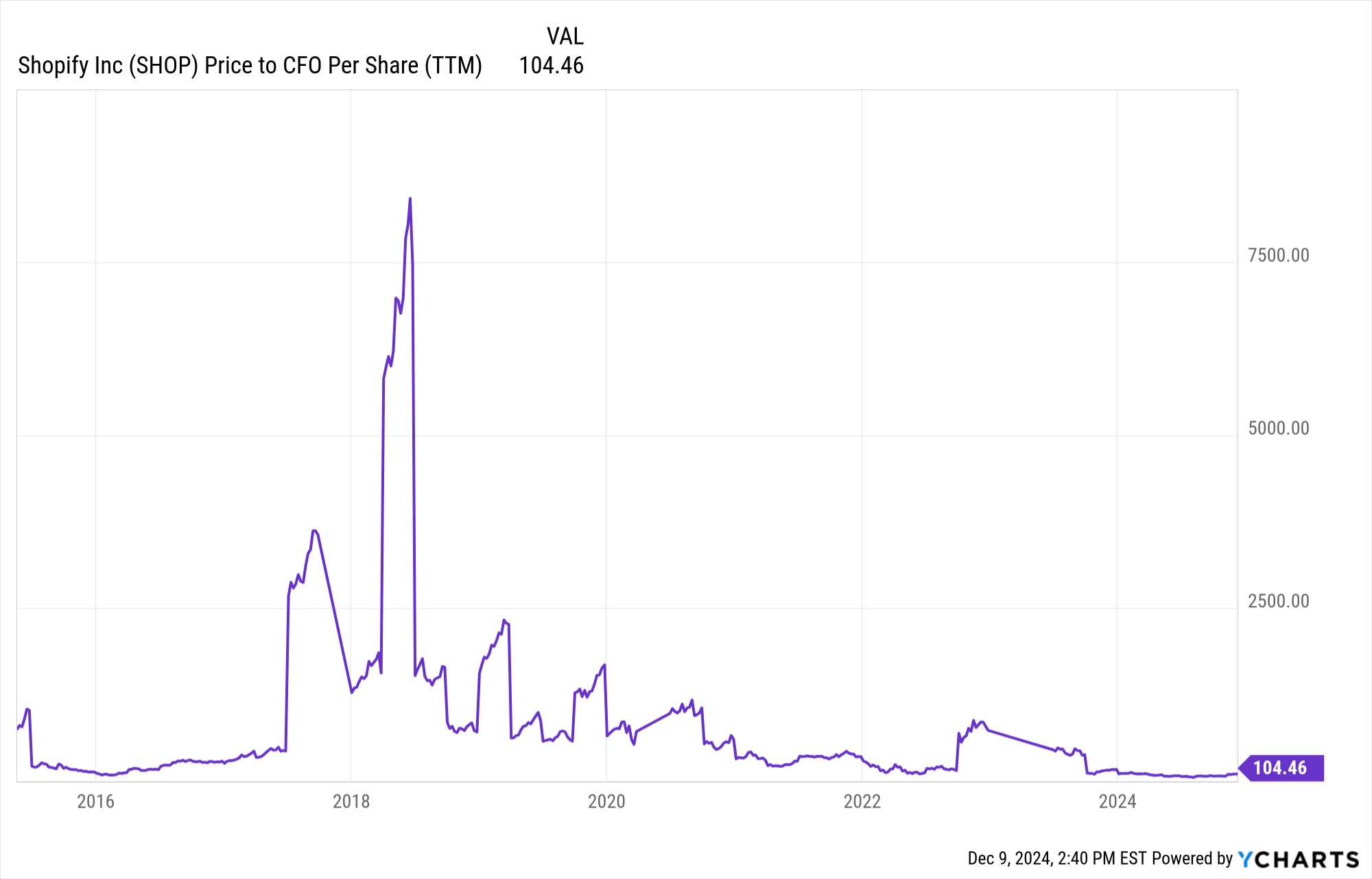 And when it comes to cash flow from operations, which is the metric most folks use to analyze mega-competitor Amazon, Shopify has also drifted back down to a much lower valuation, roughly where they were in their early days at about 800-100X CFO, though by that measure, too, the valuation has been turning up a big in recent months.