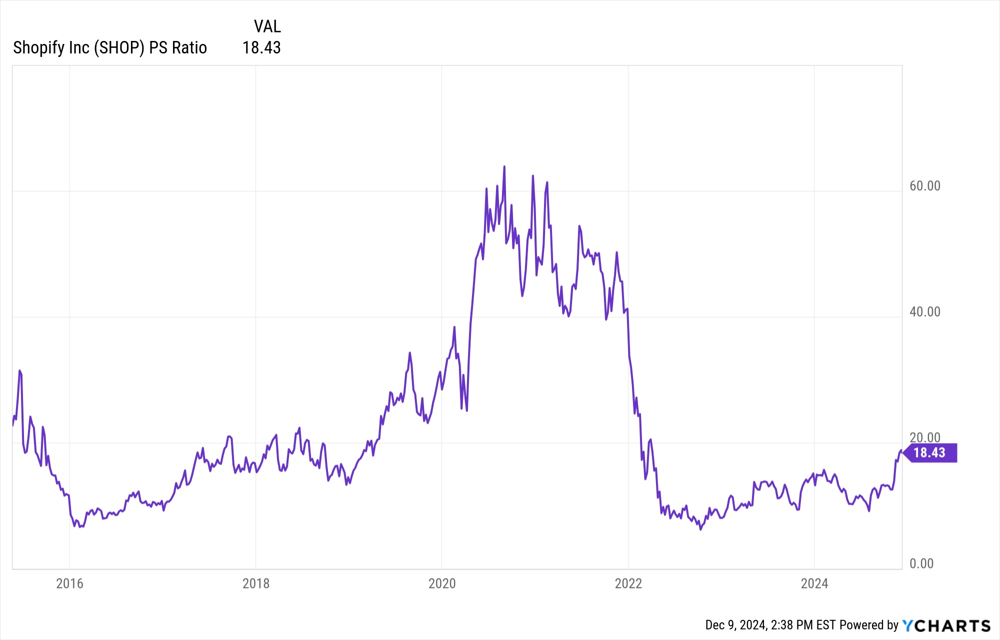 Well, the valuation for a while got back to where it was in the early days… they were down around 10X sales back in 2016, and they drifted back down to about 12X sales over the Summer, the last time I covered a similar pitch. That’s a welcome dose of sobriety after that crazy year or so when they traded at 50-60X sales… but the punchbowl is starting to fill up again, and SHOP is closing in on 20X sales…